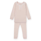 Pima cotton long sleeved pajama top and pant set. Pants have an elastic waistband and the long sleeved top has a placket featuring 3 functional buttons. Made from 100% Peruvian Cotton. Refreshed Updated Color. Our pajamas are designed with care and in compliance with CPSC safety standards. They are free from flame-retardant chemicals and are not flame resistant, so they are made to fit snugly.