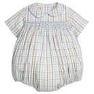 Perfect for family photos, the Winthrop collection is both elevated and timeless. Our hand-smocked Barrington Bubble features light blue smocking through the chest and light blue corduroy piping at the sleeves, chest, and peter pan collar. This heirloom-worthy one-piece is a wonderful addition to your little one's wardrobe.