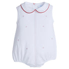 Root for the home team in classic style! Bright red and soft navy are the quintessential colorway for America’s favorite pastime. The sleeveless knit bubble features a peter pan collar with red piping and embroidered baseballs all over the body. Cute and comfortable, this fun style is sure to be a home run!