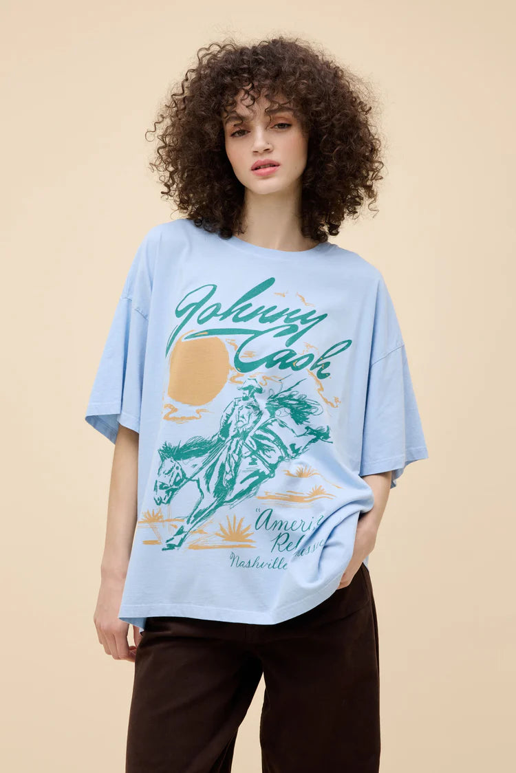 Bound to be a best seller, the epic artist Johnny Cash hits this OS Tee featuring a bucking horse graphic inspired by his country roots and a quick mention of "American Rebel," the documentary celebrating the Man In Black through his 12 greatest hits.