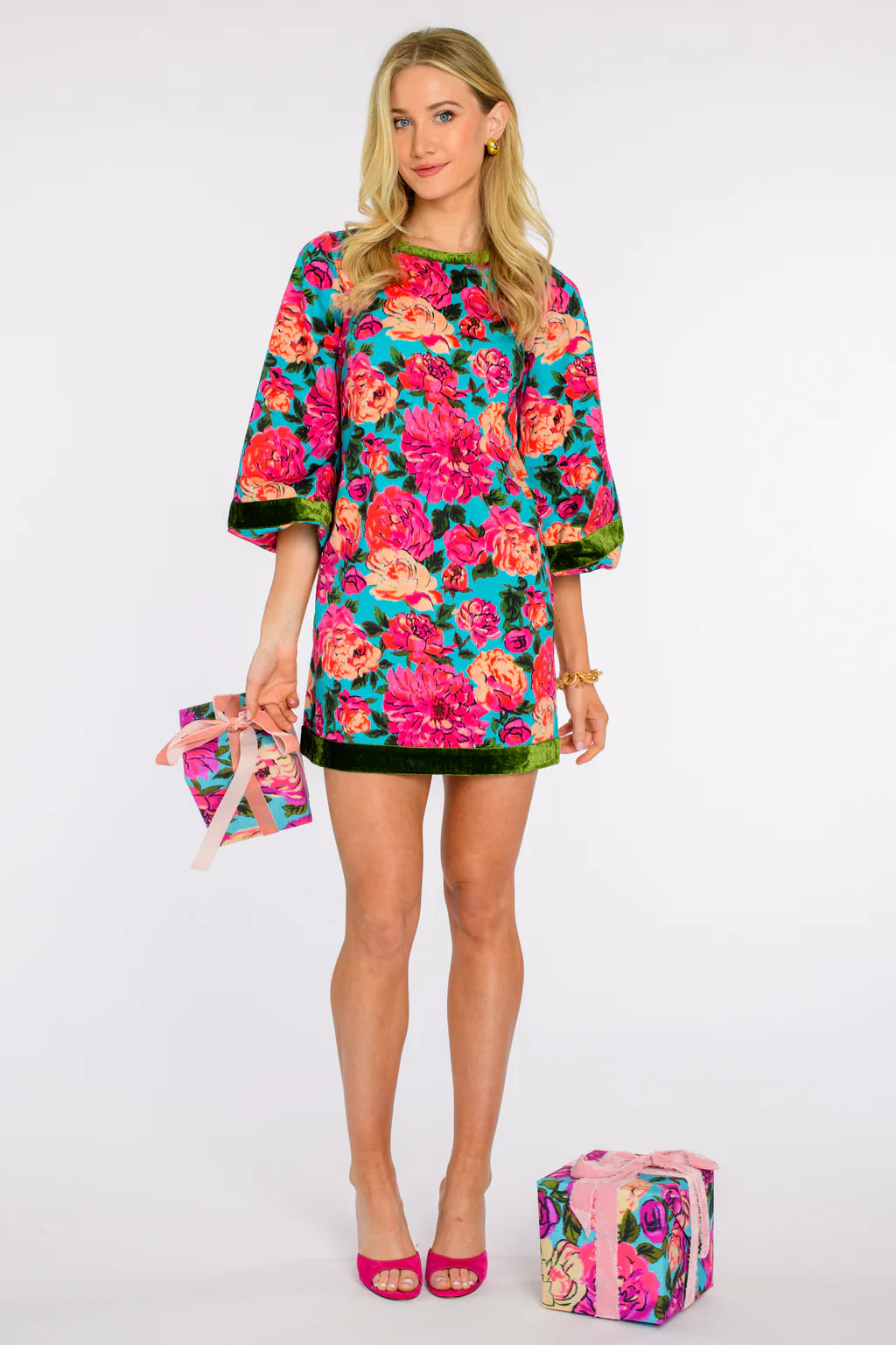 London is a seasonal shift dress, with bubble hem balloon sleeves and velvet trim. She is an easy option for all of your plans this Holiday season, whether you pair her with tights and boots or a pair of fun pink heels.