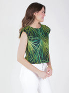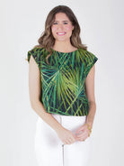 The Hatti Tank in Bellamy Palm features padded shoulder cap sleeves, a cropped hem, and back covered button closures—offering a structured silhouette with an easy, relaxed fit. This design is a vivid portrayal of low country palms, painted by Savannah artist, Bellamy. Every brushstroke captures the depth, movement, and wild elegance of the coastal landscape—turning this top into a wearable masterpiece. Pair it with the matching Paisley Pant for a head-to-toe look that blends laid-back Southern beauty with elevated, modern chic.