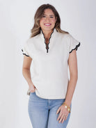 Elevate your everyday summer wardrobe with the Orchid Top in Birch. Designed with a slightly tailored silhouette, this piece features beautifully scalloped cap sleeves and a coordinating scalloped neckline for a feminine finish that feels both refined and playful. Crafted from luxurious, breathable linen, it's the ideal summer staple—lightweight, easy to wear, and endlessly versatile. Pair back with the Paisley Pant in Bellamy Palm for a coastal statement, or create an elevated, everyday look with the Saylor Short in Birch.