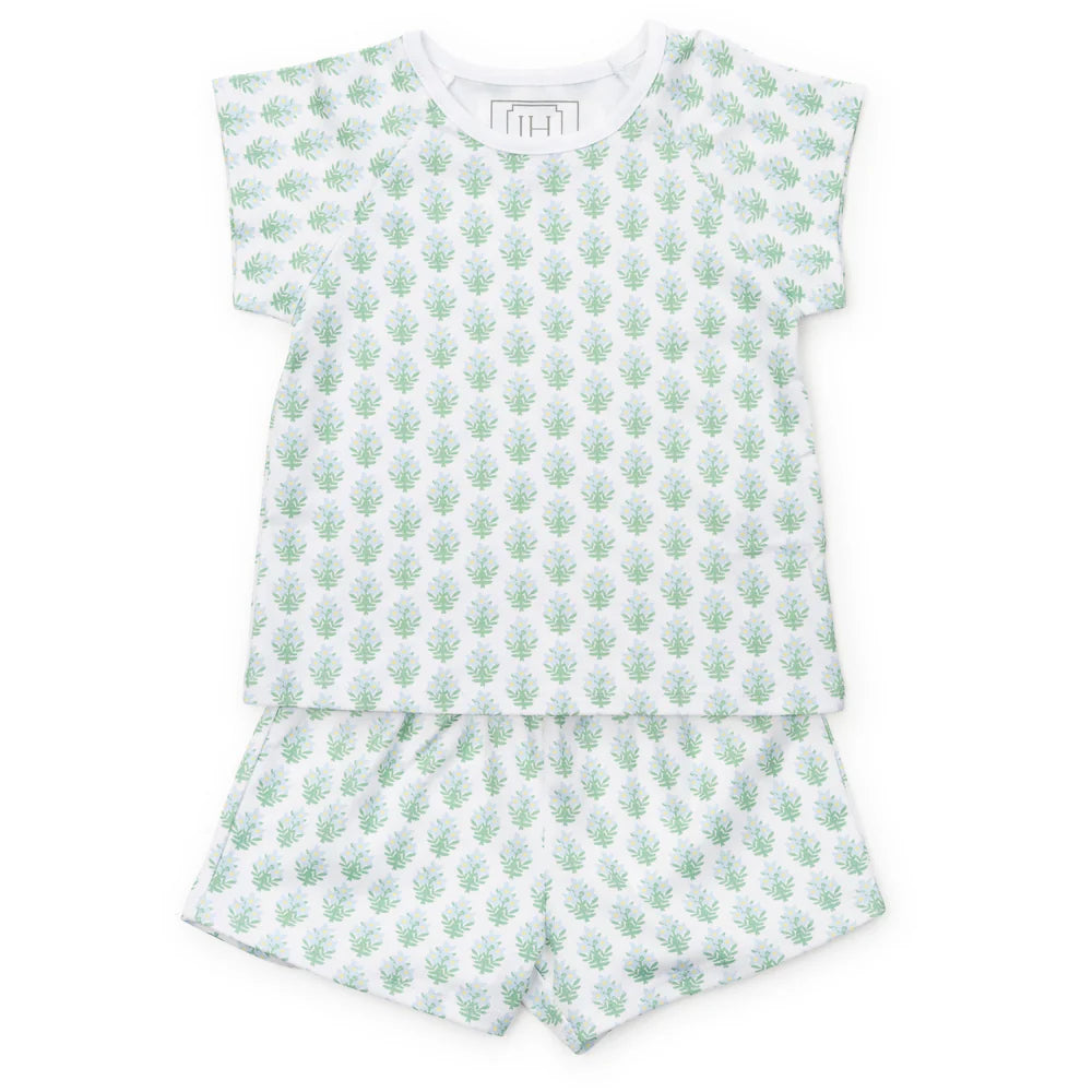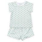 Pima cotton short cap sleeve top and short set. Top has white piping detail around the neck. Shorts have elastic waistband. Made from 100% Peruvian Pima Cotton. This item is not intended for sleepwear.