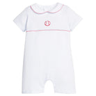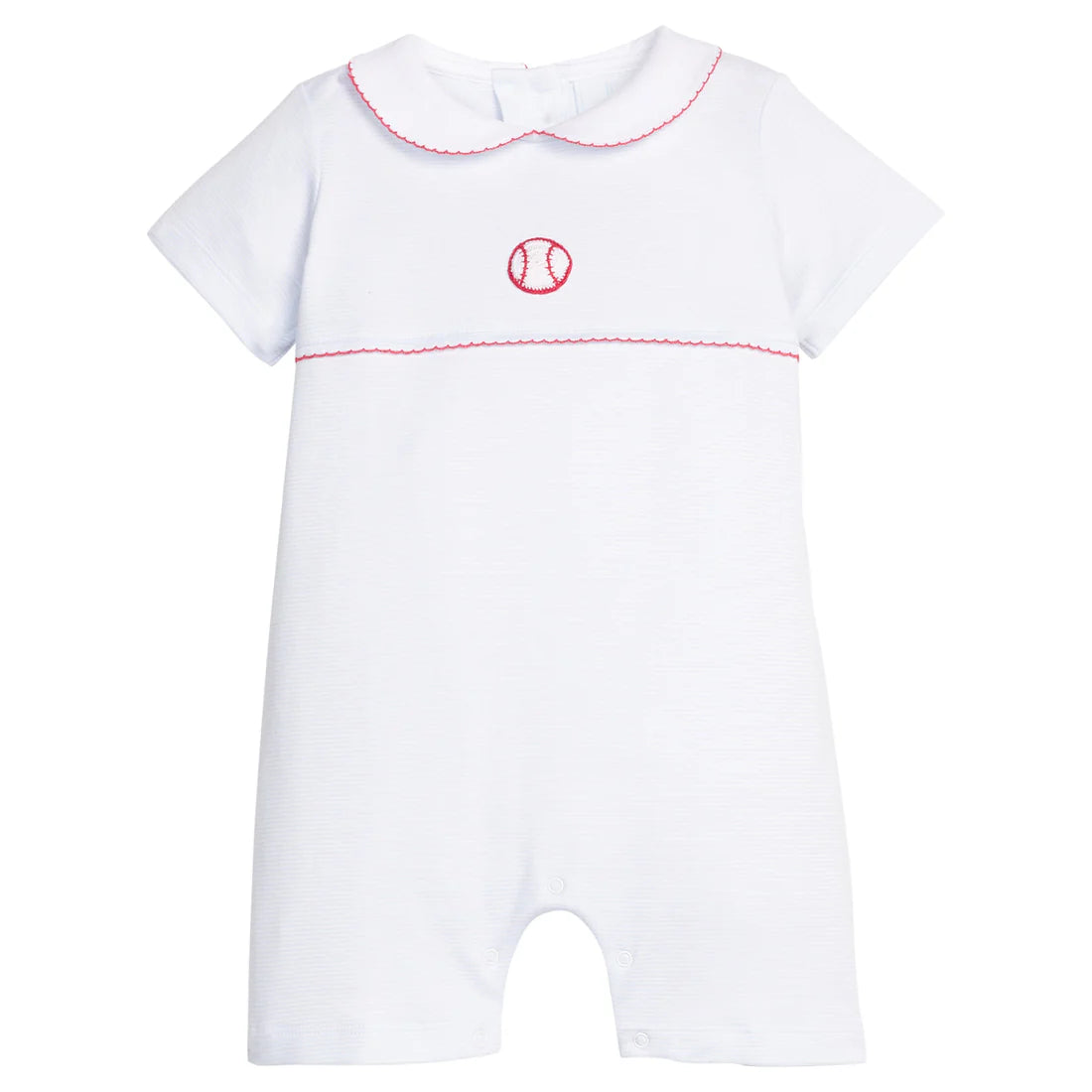 Our Little English Ream Romper looks classic and sporty in our new Baseball style this season! This sweet style for baby boy features a hand-crocheted baseball at the center chest set against light blue stripes with contrast red picot trim and a simple Peter Pan collar. Made from 100% Pima cotton, it's a soft and comfortable choice for cheering on big brother or family outings at the ballpark.