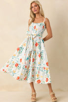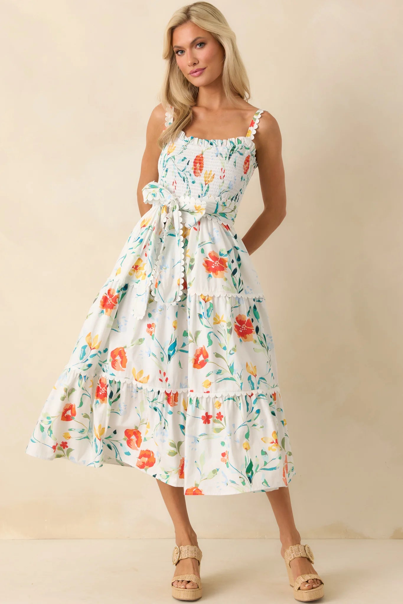 Prosperina Ivory Cotton Wild Poppies Print Darcy Maxi Dress is made for slow, sunny days and moments that feel easy and bright. It's the kind of piece that brings a little joy wherever it goes. This ivory maxi dress features an exclusive Prosperina multicolor floral print, ruffle trim sweetheart neckline, adjustable straps, fully smocked bodice, white scallop trim embroidery throughout, 100% cotton fabric, and a tiered skirt.