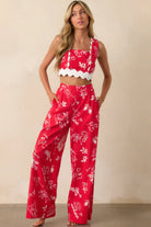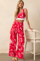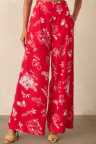 Elevate your summer style with Prosperina's Nina Red Mojito Print Wide Leg Pants! These vibrant pants will make a statement with its eye-catching print and comfortable wide leg fit. Perfect for any occasion, these pants will keep you looking and feeling confident and stylish. Add a pop of color to your wardrobe and experience the benefits of standout fashion with Prosperina! These red pants feature a high waisted design, two functional side pockets, two faux back pockets, a discrete side zipper, a wide leg design, and an elastic back waist insert.