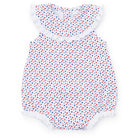 Girls' pima cotton bubble with ruffled yoke collar and ruffles around legs. Snaps in stride and back of neck. Made from 100% Peruvian Cotton.