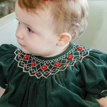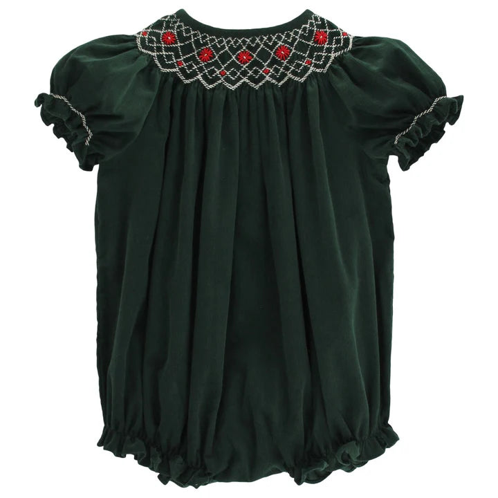 Dress your little one in timeless holiday charm with our Evergreen Elegance Forest Geometric Bishop Short Romper. This cozy short romper, made from soft forest green corduroy, features beautiful hand-smocking across the neckline in festive red and ivory geometric patterns. Delicate puff sleeves and ruffled leg hems give it a classic, heirloom feel, while the snap closures offer easy diaper changes for busy holiday moments.