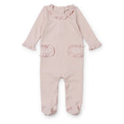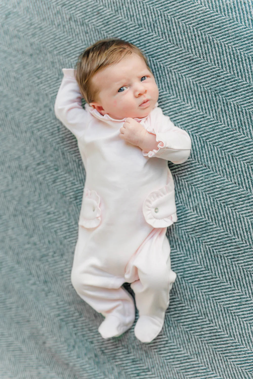 Long sleeved pima cotton footed onesie with ruffles around neck, collar and side plackets. Snaps in stride and back of neck.