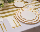 These scalloped-edge white bowls feature a stunning metallic gold trim and are the perfect touch of sophistication for any occasion. These bowls are both durable and disposable, allowing you to skip the dirty dishes, without sacrificing quality and style. Your guests will never believe they’re disposable!