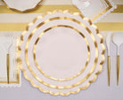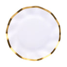 These scalloped-edge white salad plates feature a stunning metallic gold trim and are the perfect touch of sophistication for any occasion. These plates are both durable and disposable, allowing you to skip the dirty dishes, without sacrificing quality and style. Your guests will never believe they’re disposable!