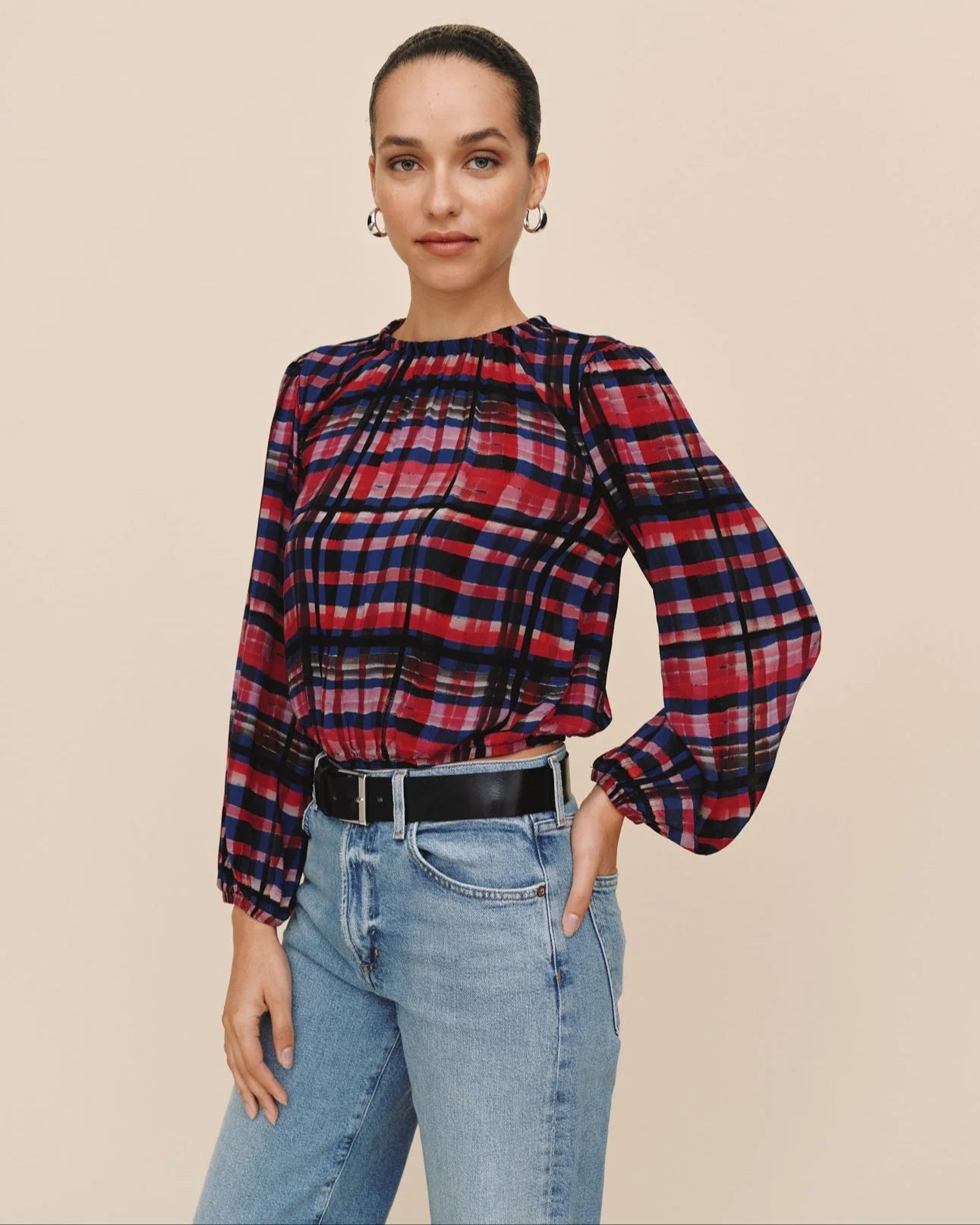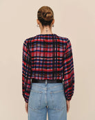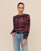The Elastic Shirred Top is defined by soft shirring and a deep-tone plaid that makes it a standout for the season.
