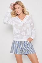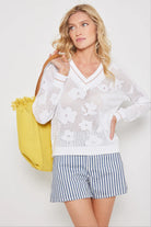 The Poppy Pullover is made from 100% luxe Cotton. The open-knit floral design is contrasted with stripes at the cuffs and neck.