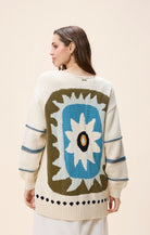 The Rumer Sweater is a statement-making, oversized cardigan crafted from 100% GOTS-certified organic cotton yarn. Designed for effortless layering, this throw-on silhouette features thoughtful rib detailing and a relaxed fit that drapes beautifully. The standout element lies in the bold artwork showcased on the back—a vibrant, artisan-inspired motif that brings personality and charm to the piece. Cozy, breathable, and undeniably eye-catching, the Rumer Sweater is the perfect blend of comfort and artistry.