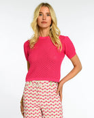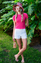Our new short sleeve Shelby sweater is a great basic to pair with your favorite shorts, pants, or skirts and looks great layered under jackets. Slightly puffed shoulders and scalloped edges add feminine touches to this spring staple.
