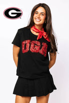 Show your Bulldog pride in style with this licensed "UGA" black tee. Featuring sparkling multi-jewel letters, it’s the perfect game day shirt to stand out in the crowd. Comfortable and eye-catching, this tee lets you cheer on your team with flair and spirit.