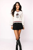 Show your Bulldogs pride with this vintage-inspired white V-neck sweater, featuring stylish striped cuffs and a subtle sequin Georgia Bulldog mascot. Its classic design combines timeless comfort with a touch of sparkle, perfect for game day or casual wear. Elevate your fan wardrobe while staying cozy and chic.