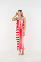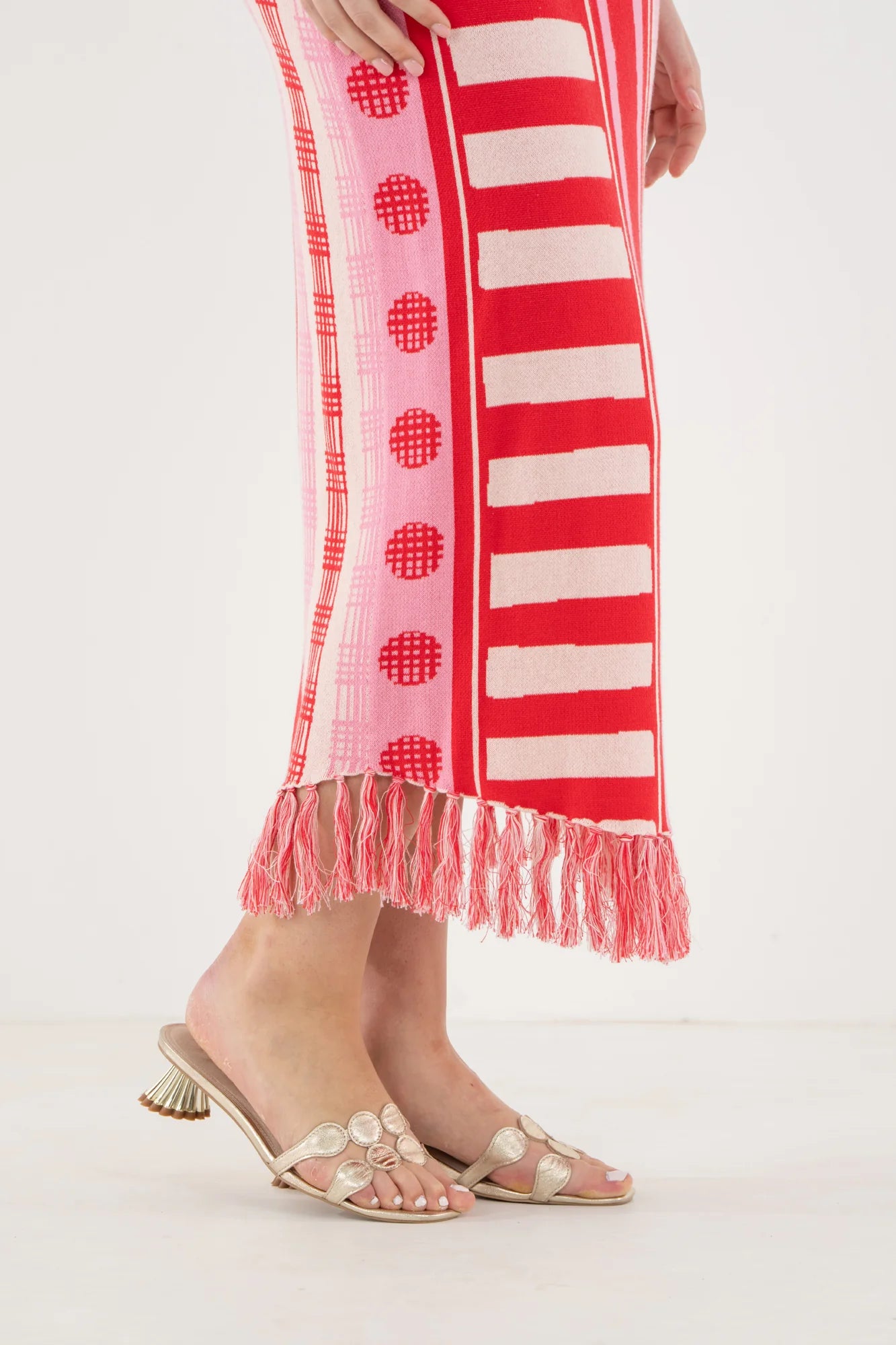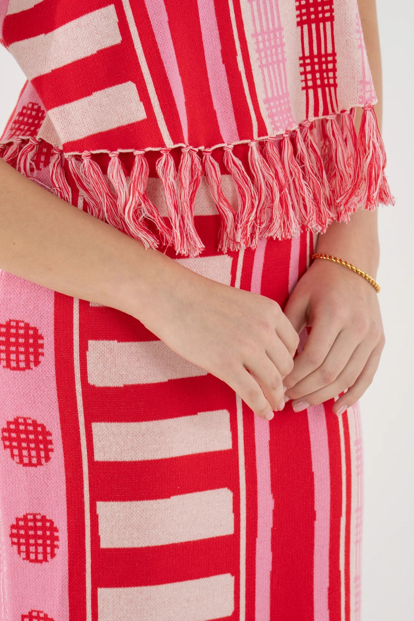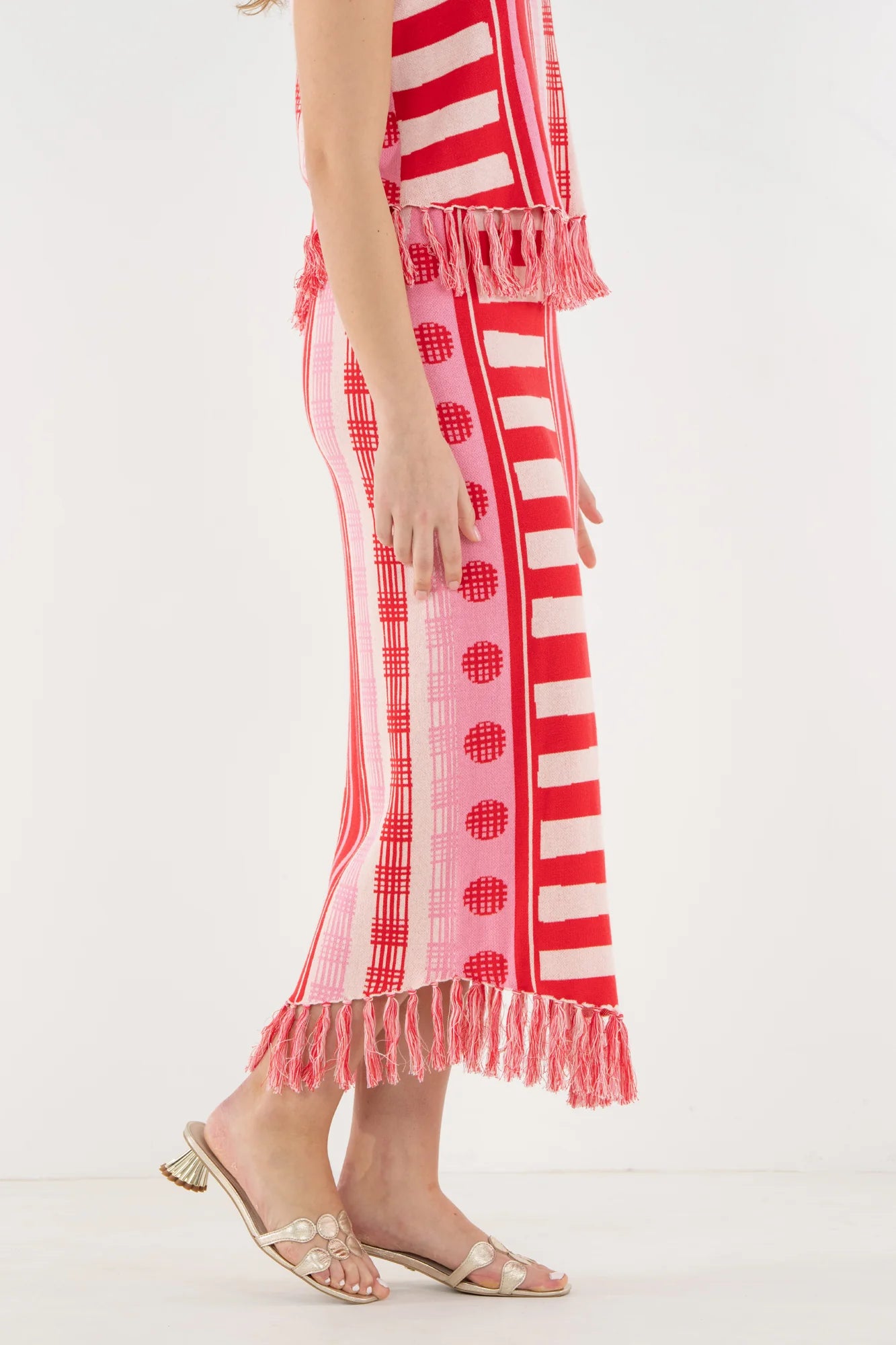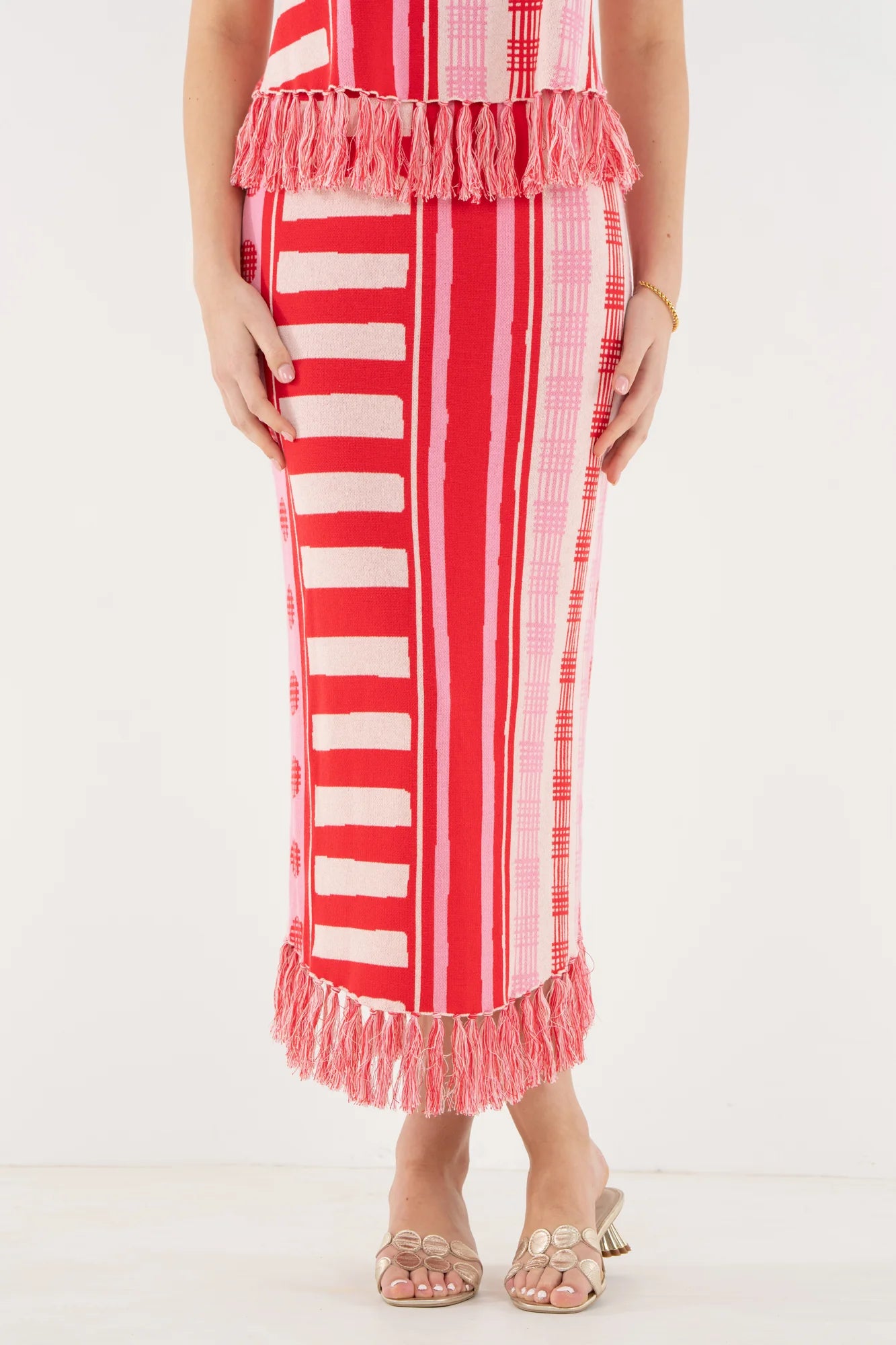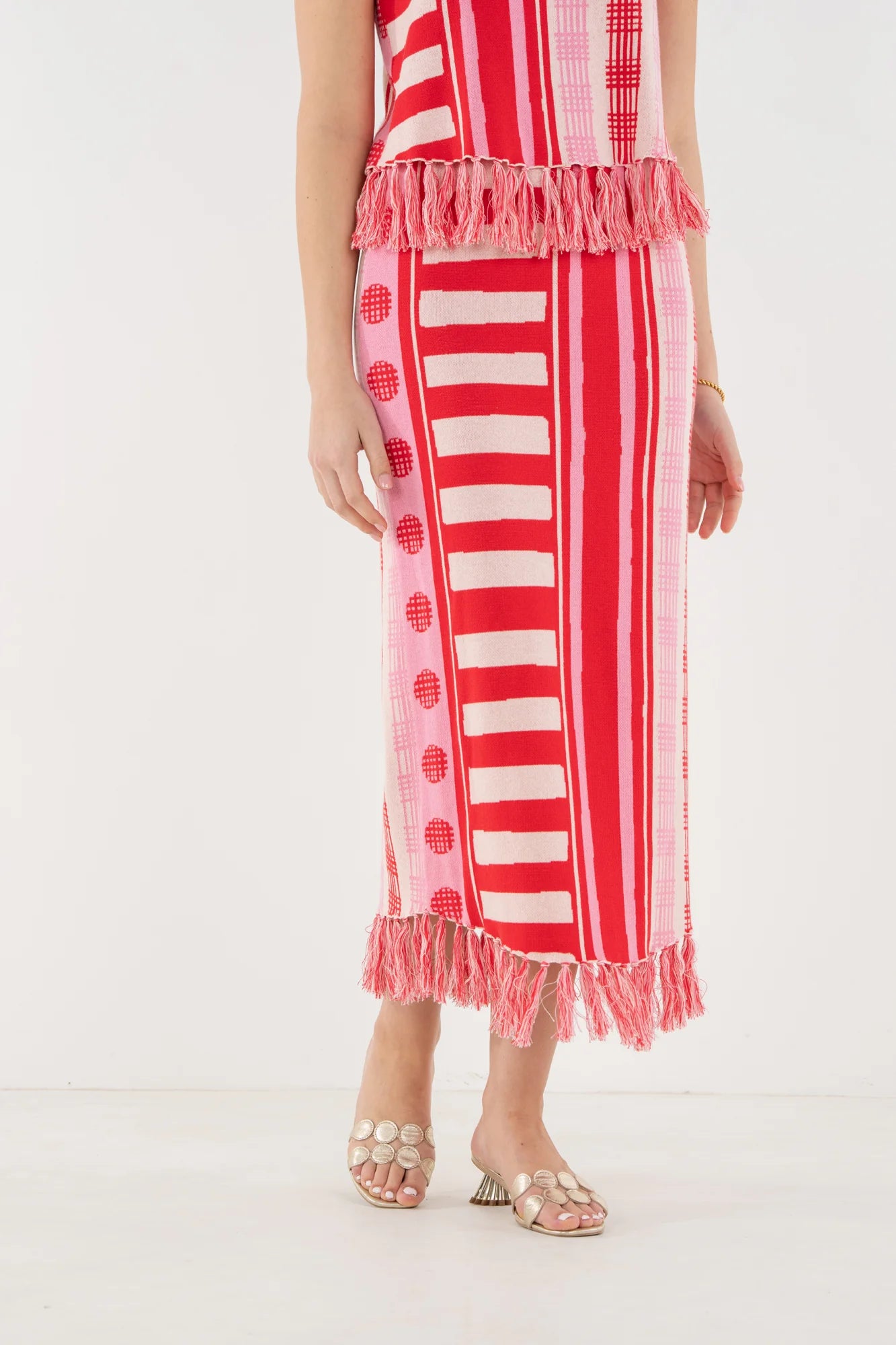 The Capri Knit Skirt in Peach Jubilee is a flattering, fitted silhouette brought to life with a playful mix of vibrant patterns. Designed with a comfortable stretch waistband, this style sits smoothly at the waist and falls with an easy drape. Fringe detailing along the hem adds texture and movement, giving the skirt a lighthearted finish. Bold yet effortless, it stands beautifully on its own or can be paired with the Capri Knit Tank for a coordinated, statement-making look.