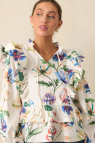 The Prosperina Faye Ivory Multi Floral Print Cotton Ruffle Top has a lighthearted elegance, the kind of charm that makes any moment feel a touch brighter. This ivory top features an exclusive Prosperina multicolor floral print, a notch v-neckline, optional self-tie tassels, ruffle panel detailing throughout, long sleeves, elastic cuffs, and a relaxed fit.