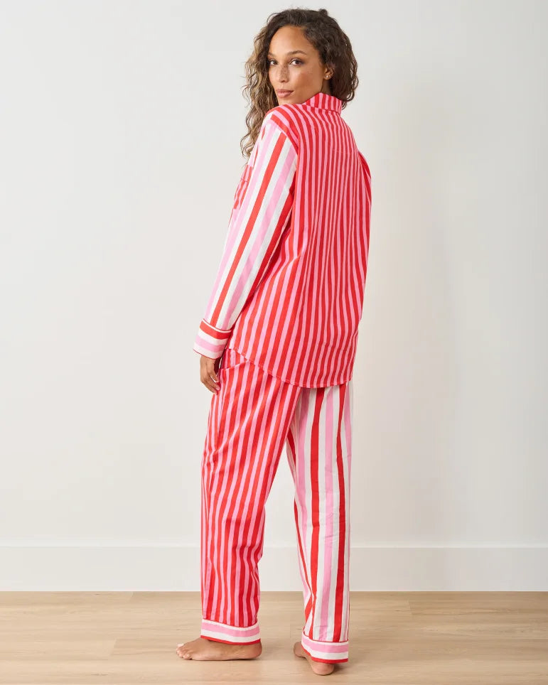 Unwrap the magic of the season with our Gift Wrapping cotton pajamas in Peppermint Swirl. These holiday striped pajamas feature breathable organic cotton that softens with every wash. The pajama set includes a chic button-down top that pairs perfectly with relaxed pants. With pockets for essentials, it's the perfect peppermint pajama set for holiday lounging.