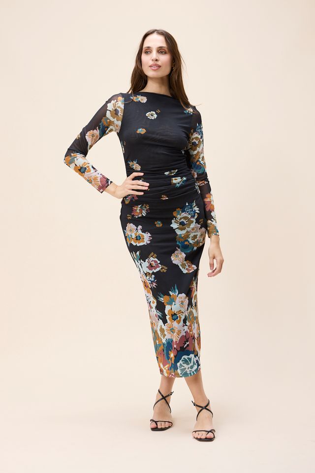 The Lura Mesh Midi Dress is a striking, body-skimming silhouette ethically handmade in India from a soft, flexible blend of 88% nylon and 12% elastane. Designed in our bold Vitet Floral print, this long-sleeve mesh dress features thoughtful shirring at the waist to flatter the figure and create elegant, effortless movement. Both sophisticated and modern, the Lura is perfect for evenings out, special occasions, or elevated day-to-night dressing.