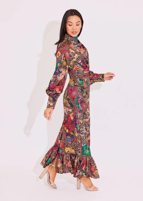 Classy and chic, The Parker Dress is making a statement with a mock neck line, balloon sleeves and a maxi skirt with ruffle trim.