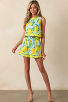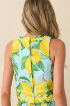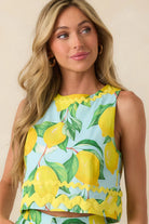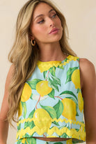 Introducing the Prosperina Claudia Blue Lemon Print Cotton Crop Top! Made with high-quality cotton, this top features a vibrant lemon print and a flattering scallop hem. Perfect for summer, this top will keep you cool and stylish. Elevate your wardrobe with this must-have piece. This blue lemon top features yellow ric rac details, a functional back lemon button design, a round neckline, a lemon design throughout, and a relaxed fit.